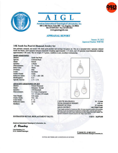18K Pendant & Earring set / 4.82ct Diamonds & 13.14mm White Pearls