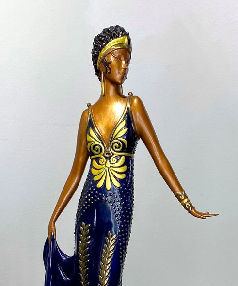 Circa 1989, Edition #HC 2 of 2 , Size 20”H × 8 1/2”W × 6 3/4”D An attractive limited edition cold painted Art Deco bronze figure of an elegant beauty dressed in a purple full length gown with excellent colour and detail, signed Erté, numbered 2/2, dated 1989 and with foundry mark.